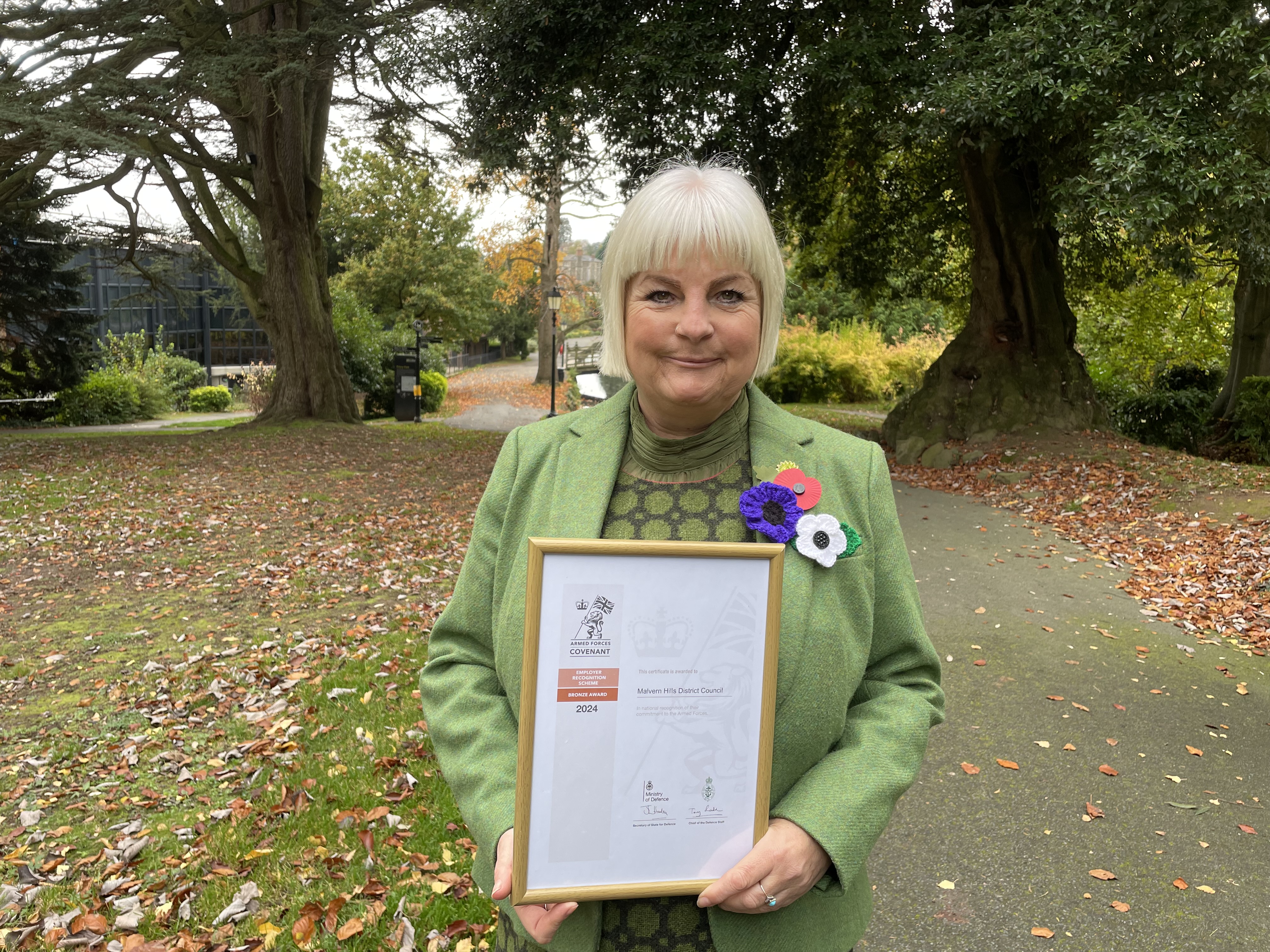 Pictured: Cllr Natalie McVey, Armed Forces Champion, with the award. She is wearing a red poppy to commemorate armed forces, a white poppy for peace, and a purple poppy for the animals who died in war.